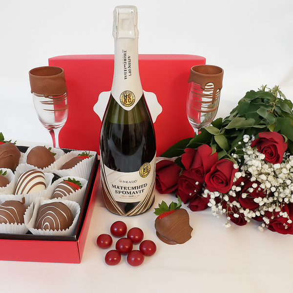 Firstly, the highlight of this basket is the Imported Champagne, chosen for its exquisite flavor and superior craftsmanship. Additionally, the basket includes Chocolate Dipped Bottle Imported Champagne bottle and chocolate dipped champagne flutes, 1-dz. of fresh red roses, Classic CHOCOLATE COVERED STRAWBERRIES - a dozen Classic Chocolate Covered Strawberries dipped in Milk, Dark or White Chocolate Beautifully packaged in Gold Ballotin with custom ribbon chocolates, each carefully selected to complement the champagne. the sophisticated presentation of the basket makes it an ideal gift for any special occasion
