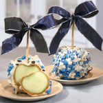 Jumbo farm fresh and scrumptious Granny Smith apples dipped in creamy caramel, then double-dipped in rich Belgian Chocolate. Finally they are topped with our Rocky Road Mix, and Red & Green or Blue & White Chocolate Candies. These incredibly large holiday apples can satisfy even the sweetest tooth.