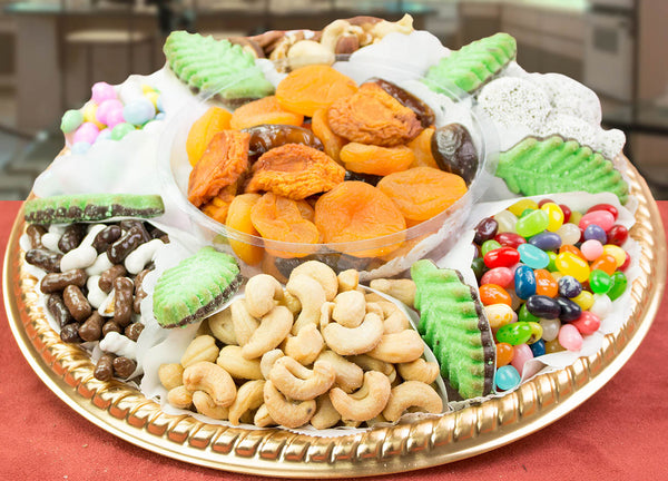 California dried fruit medley, jelly beans, tri colored pretzel nibs, non perils, chocolate covered cashews, fruit slices, giant cashews and an assortment of European cookies on a Gift tray wrapped in a silk bow.