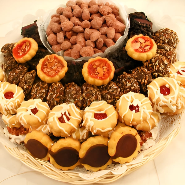 Picture Shown Largest Size Cinnamon almonds with an assortment of Delicious European fancy cookies on a Gift wicker tray wrapped in a silk bow.