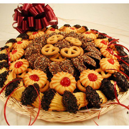 "Largest Gift Picture Shown" A delightful assortment of European fancy cookies on a Gift wicker tray wrapped in a silk bow.