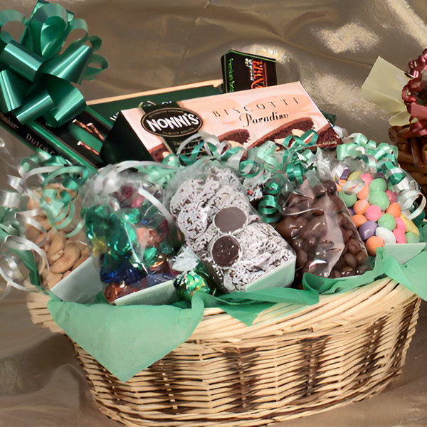 "Largest Gift Picture Shown" Holiday gift basket to delight that sweet lover person that will enjoy these biscotti's, a variety of chocolates and chocolate covered nuts in an artfully designed...