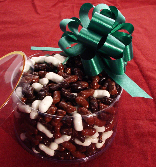 Picture Shown Largest Size Round Pretzel Nibs Tin Round Lucite tin filled to the brim with milk, white & dark chocolate covered pretzel nibs!